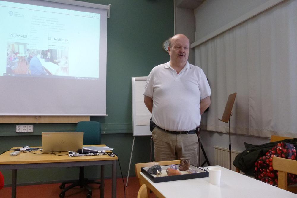 Kokoukseen saapui Kallahden kivikerhosta puheenjohtaja Vesa Tenhivaara kertomaan kiviharrastuksestaan ja korujen teosta.