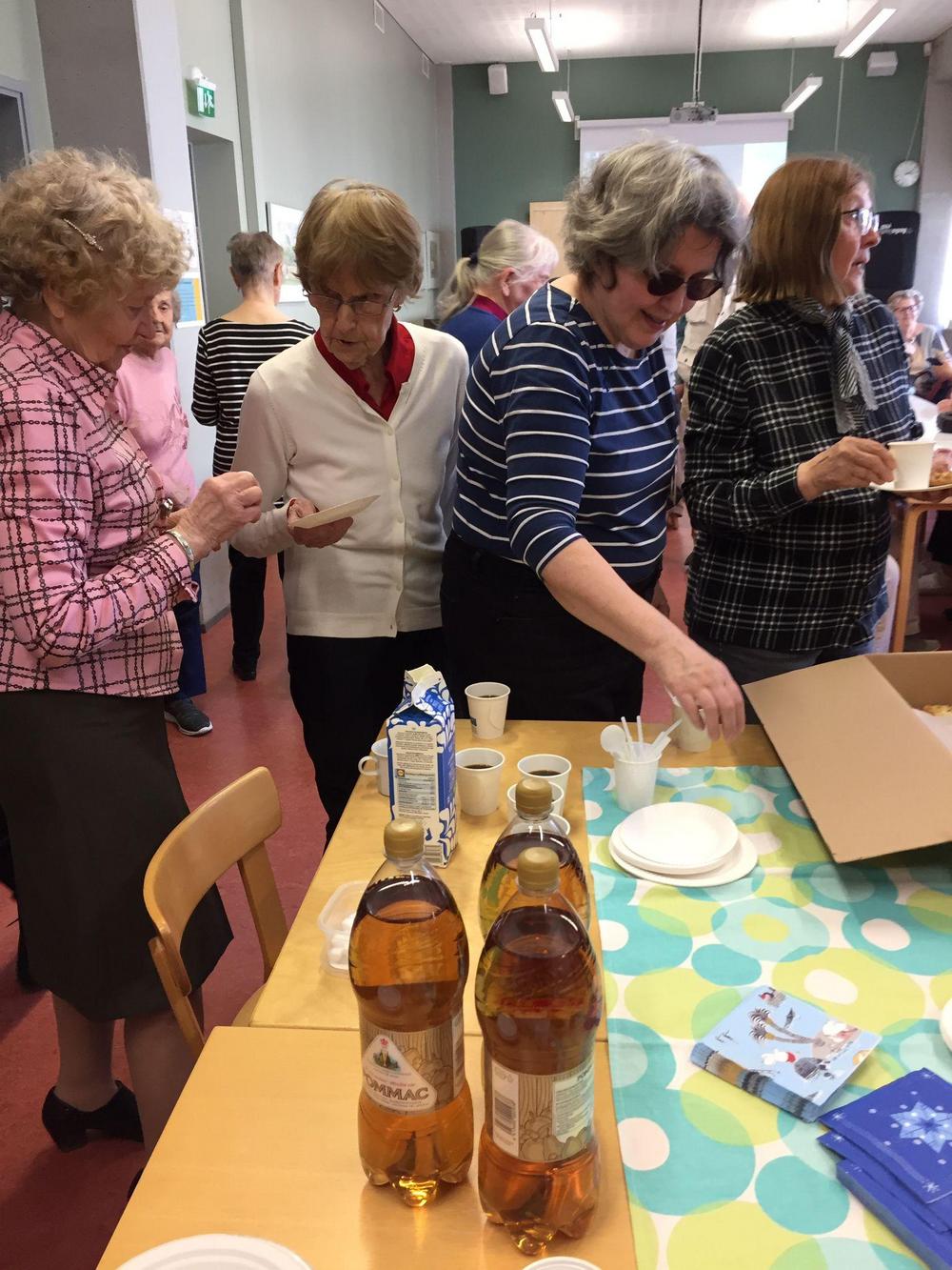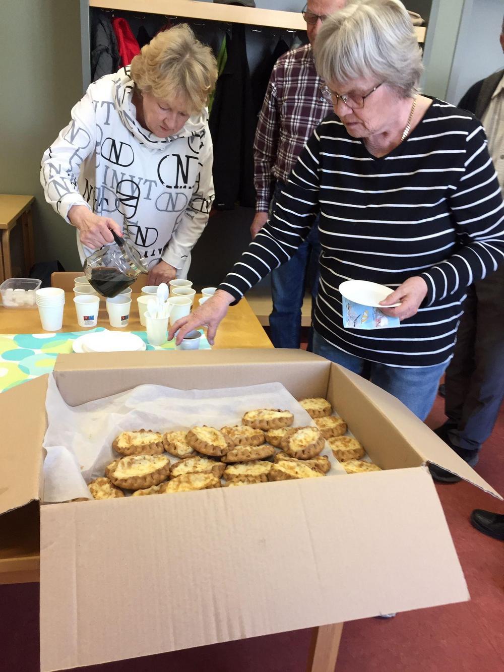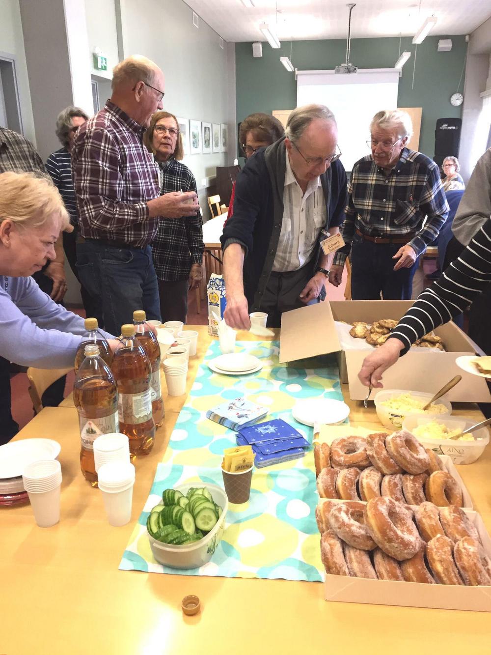 Kevätkauden viimeistä kerhokokousta vietettiin nautiskellen, oli suolaista ja makeaa, karjalanpiirakoita munavoilla sekä munkkirinkilöitä.