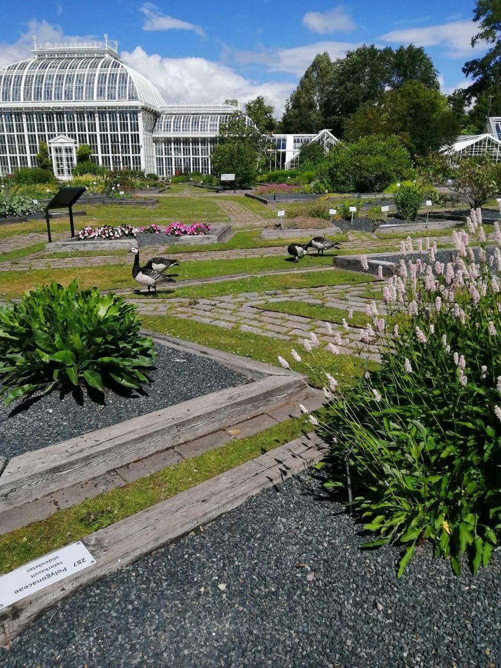 Sää oli viileä, ulkopuutarhassa kaiken kauneuden keskellä, valkoposkihanhet kävelivät nurmikoilla jättäen jätöksiään, joita saimme väistellä.