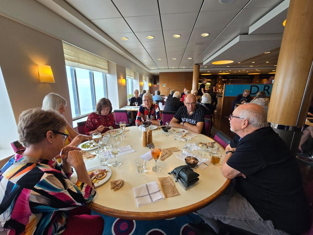 Laivalla aluksi nautimme buffetista, joka alkoikin jo klo 14.00 ja ihailimme uutta Kruununvuoren siltaa. Tallinnan satamassa vain katselimme maisemia, emmekä päässeet käymään maissa.